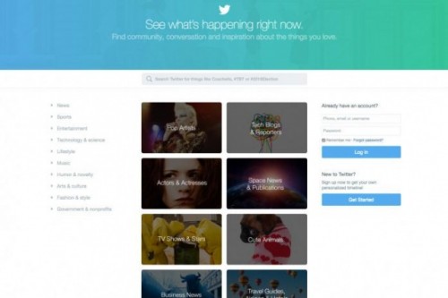 Untuk semakin banyak menjaring pengguna baru,Twitter kembali mendesain ulang tampilan halaman websitenya. Jika pada tampilan lama lebih menonjolkan pada halaman login,maka untuk tampilan baru Twitter langsung menawarkan konten dari para pengguna Twitter yang bisa dibaca tanpa harus melakukan login.